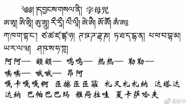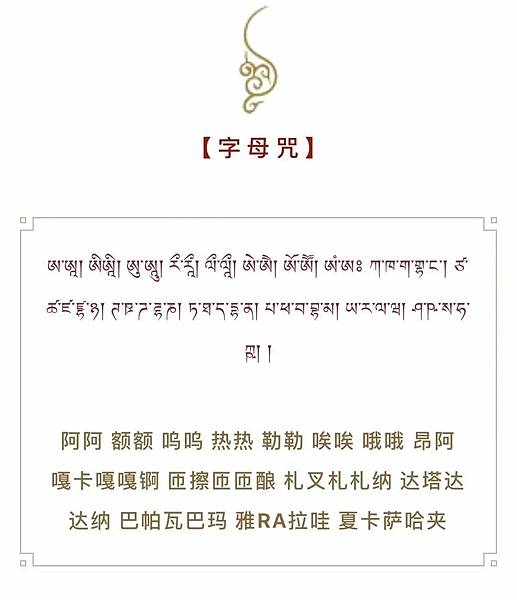 開光時念字母咒,可代表所有佛法,真正融入佛的加持力。 修法儀軌的內容里有很多的咒語,我們念的時候很容易會有發音不標準,有多念的,有少念的。字母咒能彌補這些問題。當年釋迦牟尼佛轉法輪時用的就是這些字母,因此字母咒的力量特別的不可思議,平時無論念什麼經、咒最好念三遍字母咒,這樣能完全彌補我們在念誦過程中,發音錯誤等各種過失。