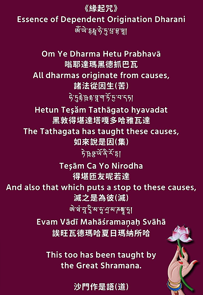 緣起偈(咒)非常有名,當年,釋迦佛座下的第一雙弟子 - 舍利弗、目建連,由聞此偈而證初果。現在我們每天念誦,也希望能得到此智慧的熏染。